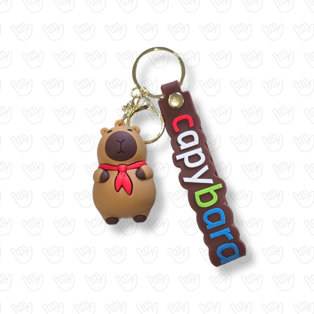 Figura de Capibara (o Carpincho) con un tierno pañuelo rojo al cuello, capturando toda la esencia zen de este animalito. Viene con una correa de silicona marrón con la palabra “Capybara” en relieve multicolor, ideal para los amantes de la naturaleza y los memes.