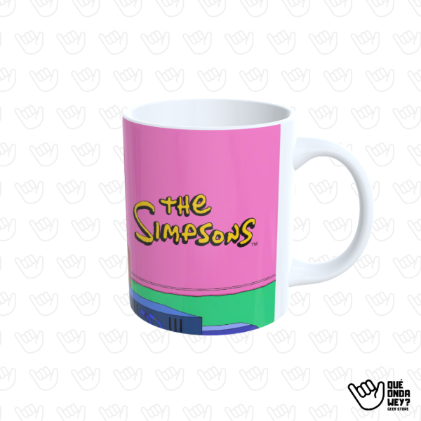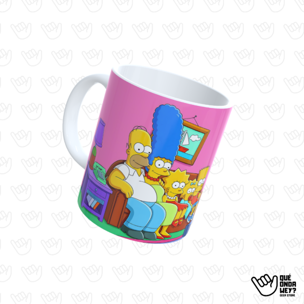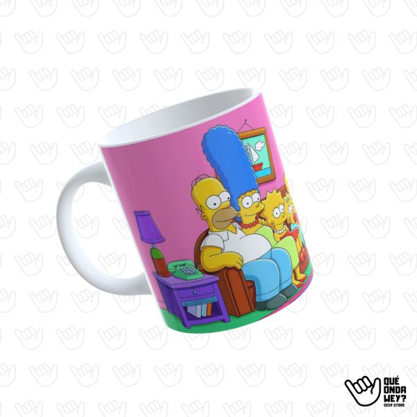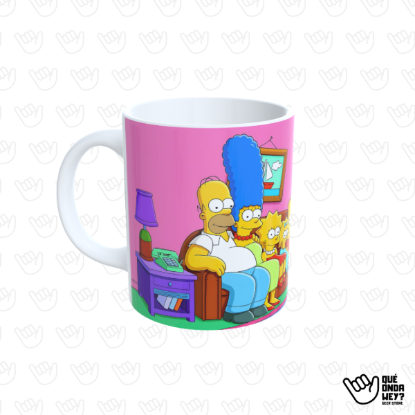 Blanca brillante con la familia Simpson en el sofá frente a la tele. Perfecta para fans de Springfield que arrancan el día con café y episodio.